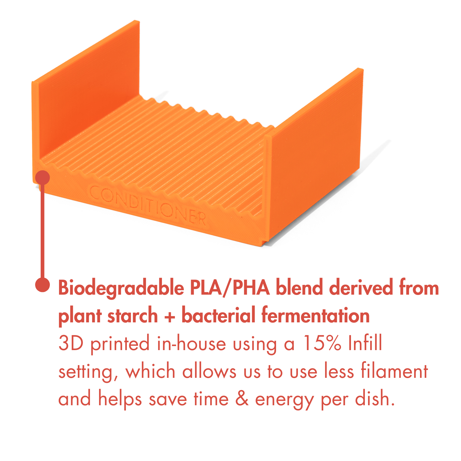 صحن صابون قابل للتحلل. مصنوع من مزيج PLA / PHA المشتق من نشا النبات والتخمير البكتيري.